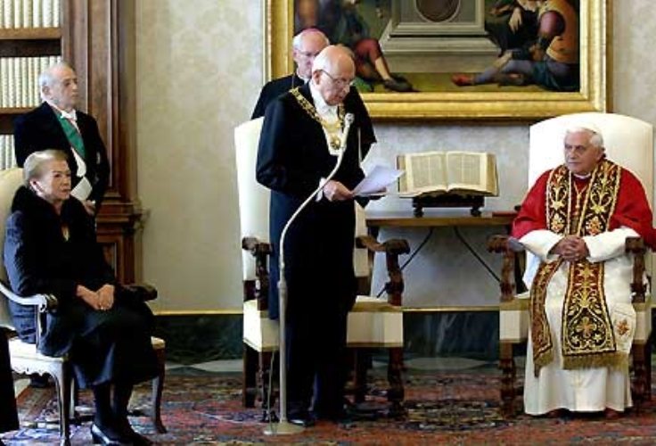 Il Presidente Giorgio Napolitano, nella foto con la moglie Signora Clio rivolge il suo discorso a Sua Santità Benedetto XVI, in occasione della Visita Ufficiale in Vaticano.
