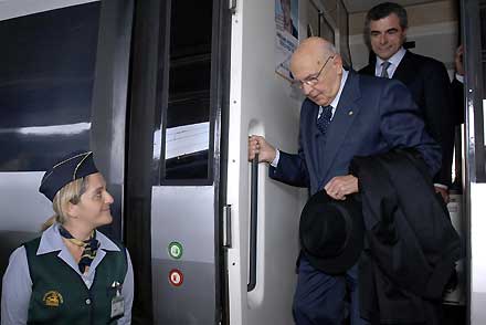Il Presidente Giorgio Napolitano all'arrivo nella stazione di centrale, nella foto con Mauro Moretti, Amministratore Delegato della Società Ferrovie dello Stato