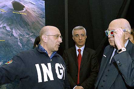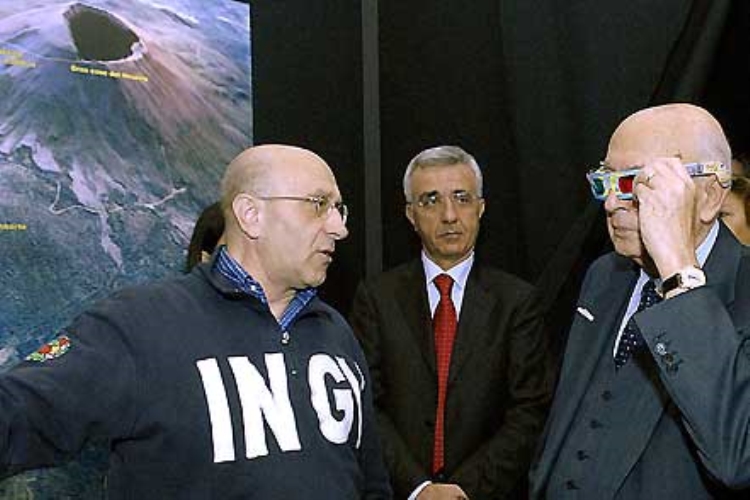Il Presidente Giorgio Napolitano osserva con occhiali tridimensionali gli effetti simulati di una eruzione vulcanica