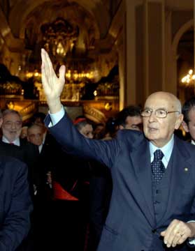 Il Presidente Giorgio Napolitano risponde al saluto della gente all'uscita dalla Chiesa di Santa Maria della Sanità