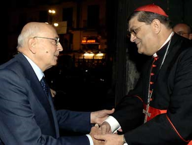 Il Presidente Giorgio Napolitano accolto da S.E. il Cardinale Crescenzio Sepe all'arrivo alla Chiesa di Santa Maria della Sanità