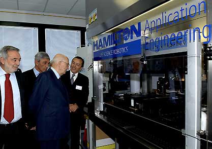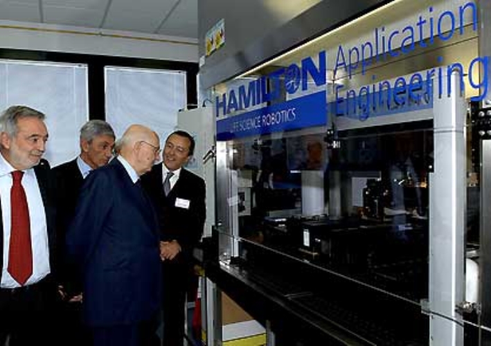 Il Presidente Giorgio Napolitano, nella foto con il Ministro Nicolais, il Presidente della Regione Bassolino ed il Direttore del Dipartimento Scienza e Vita Martini, durante la visita alle "Camere Bianche".