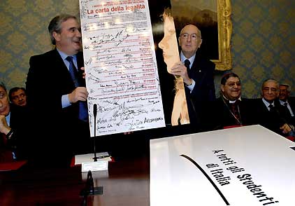 Il Presidente Giorgio Napolitano con il Ministro della della Pubblica Istruzione, Giuseppe Fioroni ed il Cardinale Crescenzio Sepe, durante la cerimonia della firma di due protocolli d'intesa tra il mondo della scuola e le autorità locali