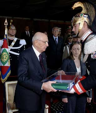 Il Presidente Giorgio Napolitano consegna la Bandiera del Contingente Italiano della Missione in Iraq "Antica Babilonia" ad un Corazziere, dopo averla ricevuta dal Ministro della Difesa Arturo Parisi.