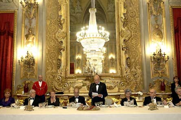 Il Presidente Giorgio Napolitano durante il pranzo ufficiale rivolge il suo indirizzo di saluto all'illustre ospite alla presenza del Presidente del Senato Marini e della Camera Bertinotti