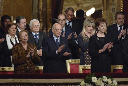 Il Presidente Giorgio Napolitano con la moglie Clio al Teatro alla Scala, in occasione del concerto per il 50° anniversario della morte di Arturo Toscanini, eseguito dalla Filarmonica della Scala