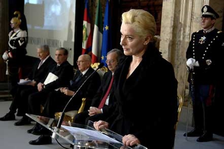 L'Attrice Monica Guerritore legge alcuni brani di lettere scritte da Enzo Sereni, deportato in un campo di concentramento, in occasione della celebrazione del "Giorno della Memoria" presente il Presidente della Repubblica Giorgio Napolitano e le massime Autorità Istituzionali
