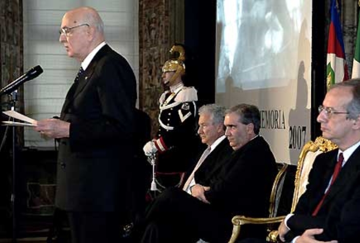 Il Presidente Giorgio Napolitano, nella foto con il Ministro della Pubblica Istruzione, Giuseppe Fioroni, il Sindaco di Roma Walter Veltroni ed il Presidente dell'UCEI Renzo Gattegna, durante il suo intervento per la celebrazione del "Giorno della Memoria"