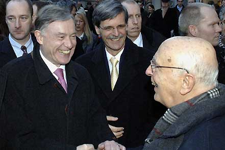 Il saluto dei Presidenti Giorgio Napolitano della Repubblica Italiana e Horst Kohler della Repubblica Federale di Germania al termine della breve passeggiata in città. Al centro della foto il Magnifico Rettore dell'Università Bernd Engler