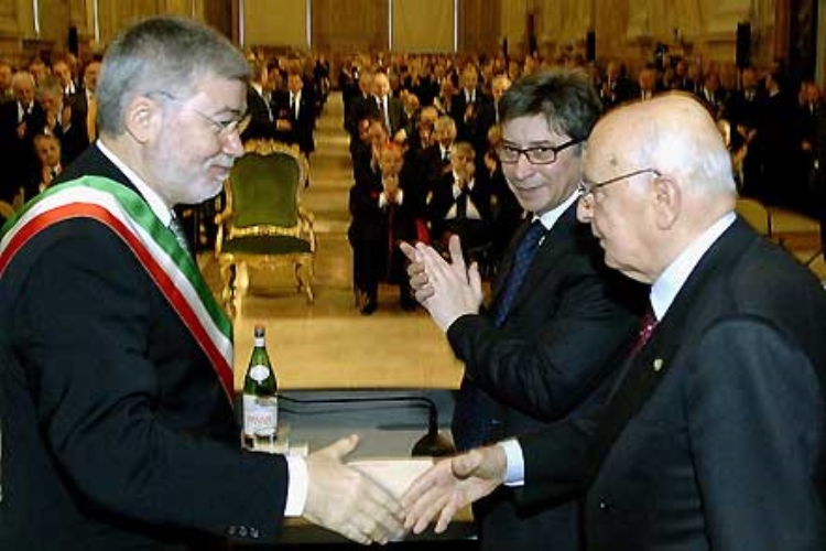 Il Presidente Giorgio Napoliano con Vasco Errani, Presidente della Giunta Regionale e Sergio Cofferati, Sindaco della città al termine del suo intervento