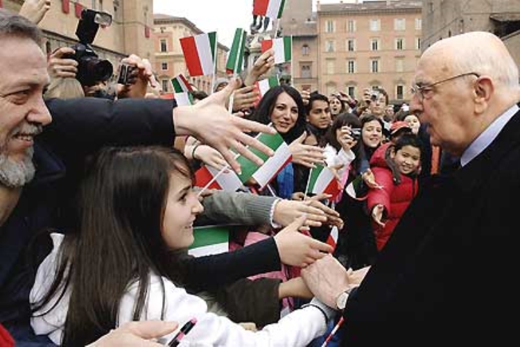 Il Presidente Giorgio Napolitano festeggiato dai ragazzi di alcune scuole all'arrivo a Palazzo D'Accursio
