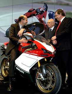 Il Presidente Giorgio Napolitano con il Ministro Bersani ed il Presidente della Ducati, Federico Minoli, con la motocicletta 1098 (Tricolore)