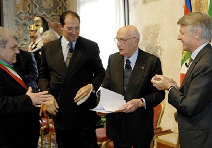 Il Presidente Giorgio Napolitano con da sinistra, il Sindaco Gian Paolo Gobbo, il Presidente della Regione Giancarlo Galan ed il moderatore Ferruccio De Bortoli, al termine del convegno degli imprenditori del Nord- Est