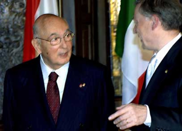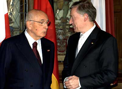 Il Presidente Giorgio Napolitano con il Presidente della Repubblica Federale di Germania, Horst Kohler, durante la pausa della prima sessione dei lavori "Europa come attore globale".