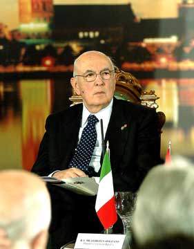 Il Presidente Giorgio Napolitano durante l'incontro con studenti universitari e ricercatori alla Blackheads House, unitamente agli altri Capi di Stato.