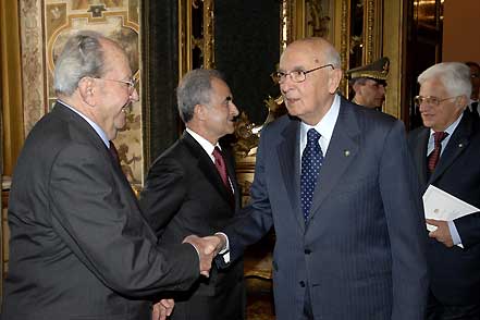 Il Presidente Giorgio Napolitano con il Presidente della Confederazione Italiana fra le Associazioni Combattentistiche e Partigiane On. Gerardo Agostini in occasione della cerimonia con gli esponenti delle associazioni combattentistiche e d'arma