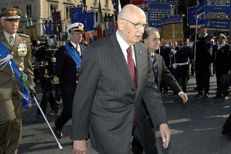Il Presidente Giorgio Napolitano, accompagnato dal Ministro della Difesa Arturo Parisi, dal capo di Stato Maggiore della Difesa Giampaolo Di Paola e dal Consigliere Militare del Presidente Rolando Mosca Moschini, al termine della cerimonia per il 62°anniversario della Liberazione durante la quale sono stati insigniti i Gonfaloni di alcuni comuni con Medaglie d'Oro al Merito Civile