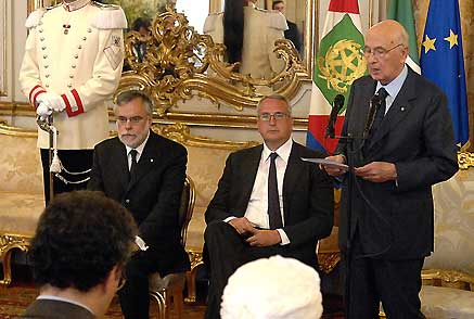 Il Presidente Giorgio Napolitano durante l'incontro con i partecipanti al Convegno Internazionale "Africa for life -against death penalty". Nella foto con Vittorio Craxi Sottosegretario agli Affari Esteri e Andrea Riccardi Fondatore della Comunità di Sant'Egidio