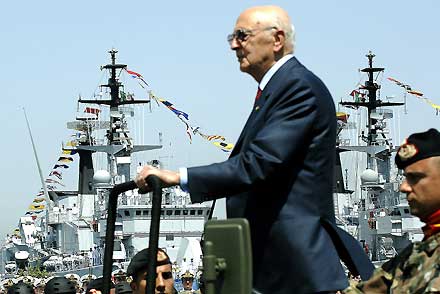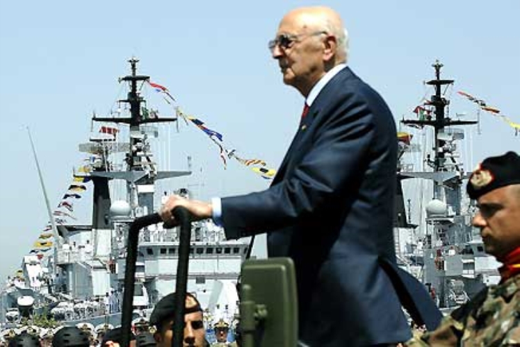 Il Presidente Giorgio Napolitano passa in rassegna lo schieramento delle rappresentative della Marina Militare e la Compagnia d'Onore schierate nel porto