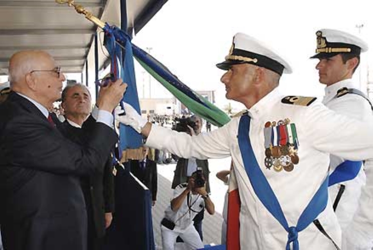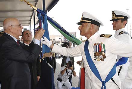 Il Presidente Giorgio Napolitano consegna la Medaglia d'Oro dell'Ordine Militare d'Italia-Classe di Cavaliere alla Bandiera del Reggimento San Marco in occasione della Festa della Marina