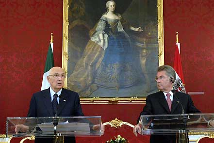 Il Presidente della Repubblica Giorgio Napolitano ed il Presidente Federale della Repubblica d'Austria, Heinz Fischer, durante le comunicazioni alla stampa al termine dei colloqui