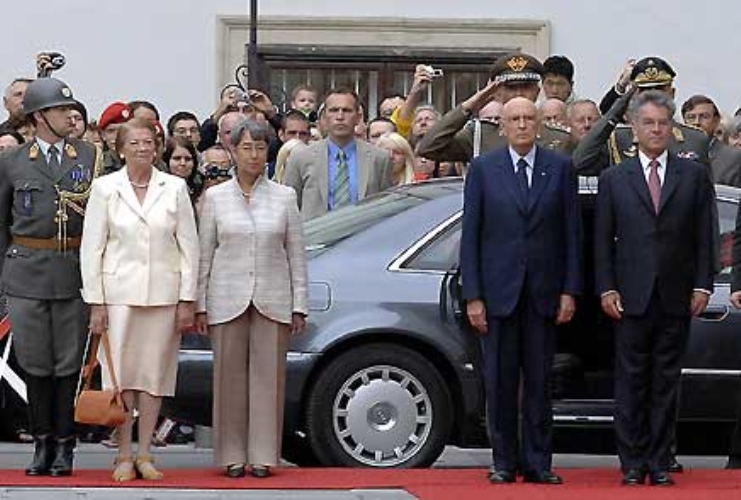 I Presidenti della Repubblica Italiana, Giorgio Napolitano e Federale della Repubblica d'Austria, Heinz Fischer con le rispettive Signore durante la cerimonia di accoglienza a palazzo Hofburg