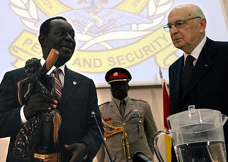Il Presidente Giorgio Napolitano durante la visita al Kofi Annan International Peacekeeping Training Center, con il Ministro della Difesa del Ghana Kwame Addo-Kufuor.
