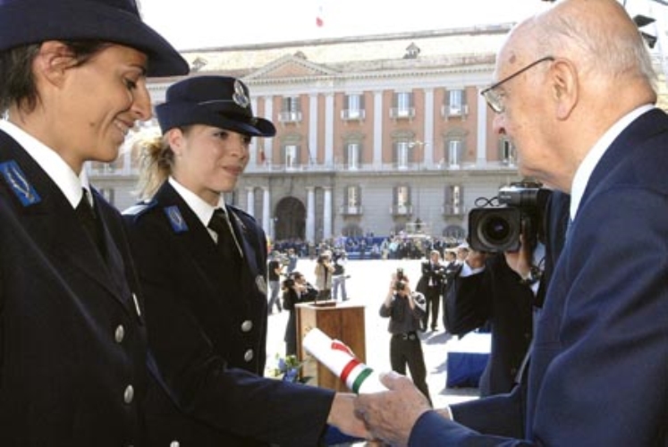 Il Presidente Giorgio Napolitano consegna l'Attestato di merito alle Agente Carolina Kostner e Nadia Cortassa, in occasione della Festa del Corpo di Polizia Penitenziaria