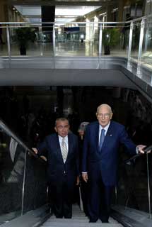 Il Presidente Giorgio Napolitano, accompagnato dal Presidente del Polo della Qualità, Guglielmo Aprile, durante la visita alla Città della Moda di Marcianise