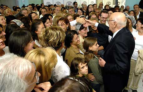 Il Presidente Giorgio Napolitano tra i lavoratori della Perugina, per festeggiare il 100° anno dalla fondazione.