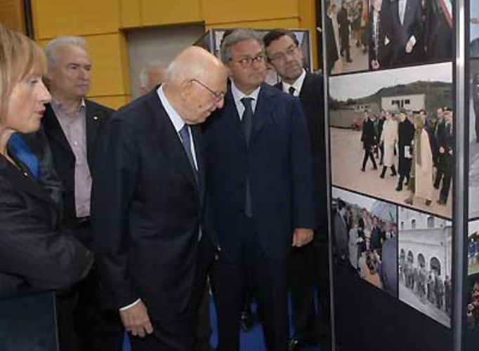 Il Presidente Giorgio Napolitano osserva una mostra fotografica che documenta la sua presenza, come Ministro dell'Interno, in Umbria a seguito del terremoto