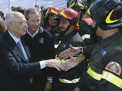 Il Presidente Giorgio Napolitano con Guido Bertolaso, Capo del Dipartimento della Protezione Civile, durante la visita nella cittadina umbra.