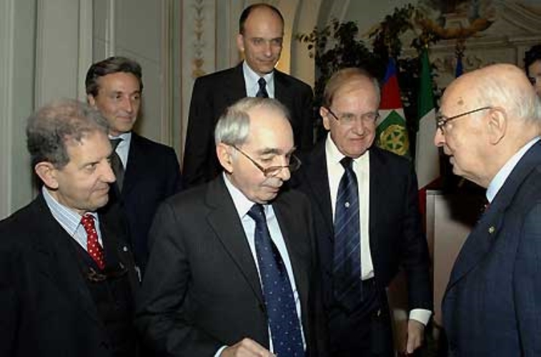 Il Presidente Giorgio Napolitano si intrattiene, al termine del convegno con i relatori G.Amato, E.Letta, V.Grilli, S.Settis Direttore della Scuola Normale e Riccardo Varaldo Presidente della Scuola Superiore Sant'Anna