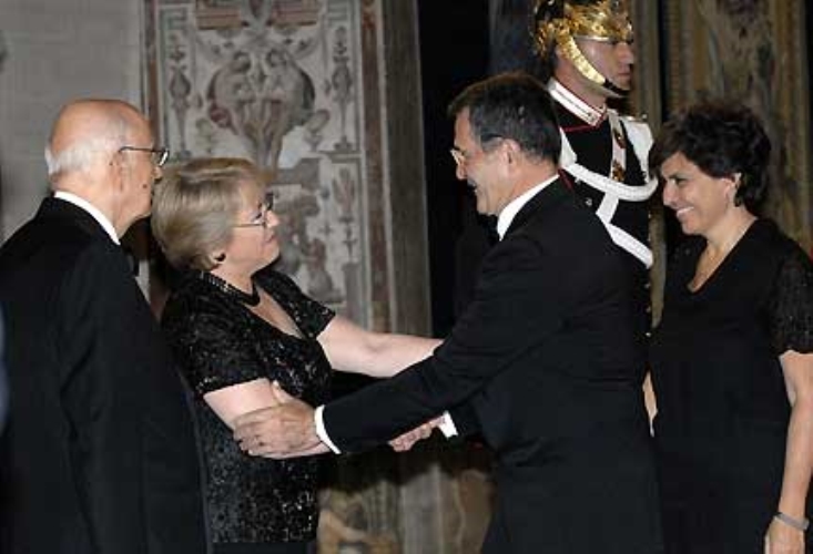 Il Presidente Giorgio Napolitano con la Signora Michelle Bachelet, Presidente della Repubblica del Cile e il Presidente del Consiglio Romano Prodi.