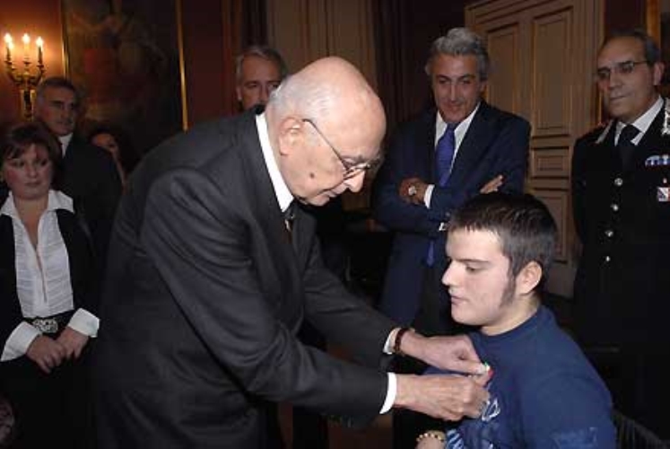 Il Presidente Giorgio Napolitano consegna al giovane Marco Siviero la Medaglia d'Oro al Valor Civile