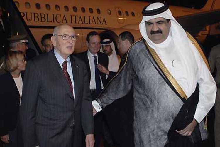Il Presidente Giorgio Napolitano accolto all'Aeroporto Internazionale di Doha da S.A.l'Emiro Hamad bin Khalifa Al Thani all'arrivo