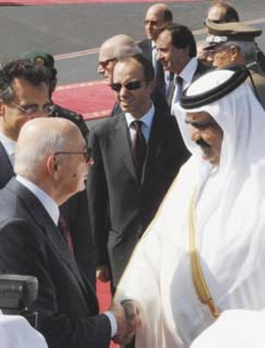 Il commiato del Presidente della Repubblica Giorgio Napolitano da S.A. l'Emiro Hammad bin Khalifa al Thani, prima della partenza per l'Italia