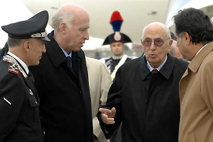 Il Presidente Giorgio Napolitano accolto all'Aeroporto di Ciampino, di ritorno dal Qatar, dal Comandante Generale dei Carabinieri, Gianfrancesco Siazzu, dal Prefetto di Roma, Carlo Mosca e dal Capo della Polizia, Antonio Manganelli