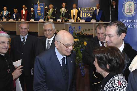 Il Presidente Giorgio Napolitano con il Rettore dell'Università degli Studi della Tuscia, Marco Mancini, in occasione della cerimonia di inaugurazione dell'Anno Accademico