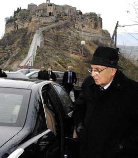 Il Presidente Giorgio Napolitano al suo arrivo a Bagnoregio per una visita a Civita, nella foto, sullo sfondo