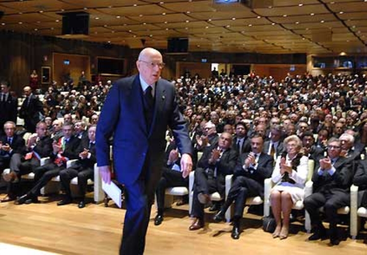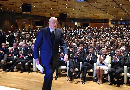 Il Presidente Giorgio Napolitano si accinge a pronunciare il suo intervento davanti agli esponenti del mondo istituzionale ed imprenditoriale