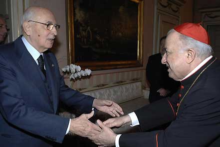 Il Presidente Giorgio Napolitano con l'Arcivescovo di Milano S.Em.za Rev.ma il Cardinale Dionigi Tettamanzi, in occasione dell'incontro in Prefettura