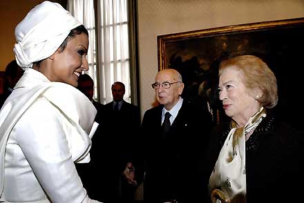 La Signora Clio ed il Presidente della Repubblica Giorgio Napolitano accolgono la Sceicca del Qatar, Mozah Bint Nasser Al Missned all'arrivo in Prefettura