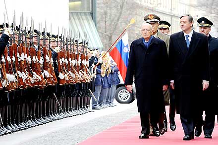 Il Presidente Giorgio Napolitano accompagnato dal Presidente della Repubblica di Slovenia Danilo Turk, riceve gli Onori militari al suo arrivo al Palazzo Presidenziale