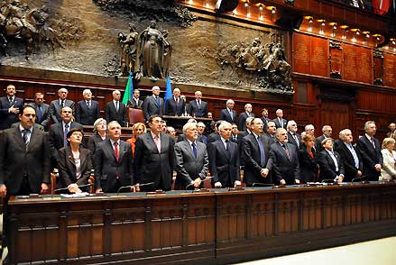 Un momento della cerimonia nell'Aula di Montecitorio, durante l'esecuzione dell'Inno Nazionale, in occasione della Seduta comune del Parlamento per la celebrazione del 60° anniversario della Costituzione