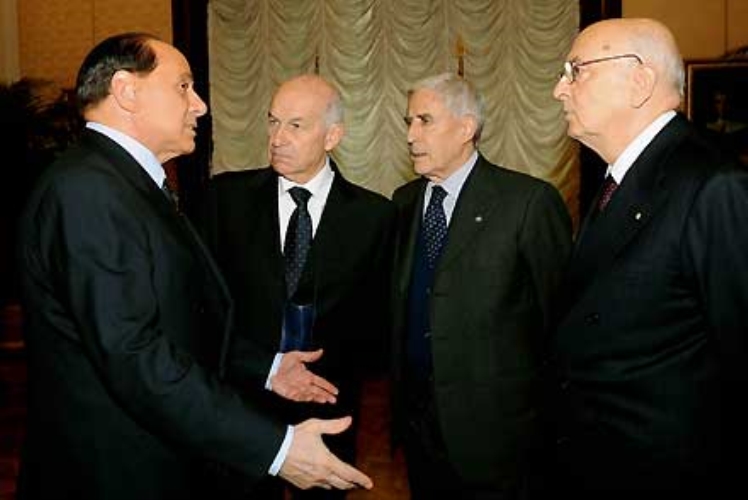 Il Presidente Giorgio Napolitano, nella foto con i Presidenti del Senato e Camera Franco Marini e Fausto Bertinotti e l'ex Presidente del Consiglio Silvio Berlusconi in occasione della Seduta comune del Parlamento per la celebrazione del 60° Anniversario della Costituzione