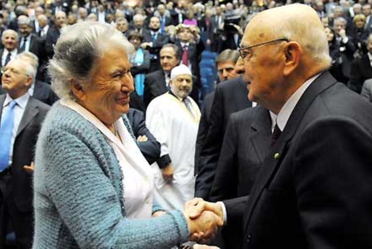 Il Presidente Giorgio Napolitano con la vedova dell'Economista Giorgio Fuà al termine dell'incontro con le Autorità nell'Aula Magna dell'Università