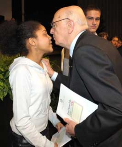 Il Presidente Giorgio Napolitano al Teatro delle Muse, dove dopo aver assistito ad un concerto, ha consegnato il Quaderno della Costituzione ad una rappresentanza di giovani.