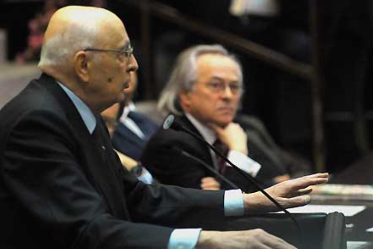 Il Presidente Giorgio Napolitano, a fianco il Rettore dell'Università Politecnica delle Marche, Marco Pacetti, durante il suo intervento nell'Aula Magna al termine del Seminario "L'economia marchigiana nel mercato globale"