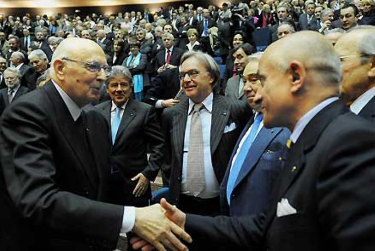 Il Presidente Giorgio Napolitano, nella foto con gli industriali Gozzini Della Valle e Pieralisi al termine del suo indirizzo di saluto ai presenti nell'Aula Magna dell'Università